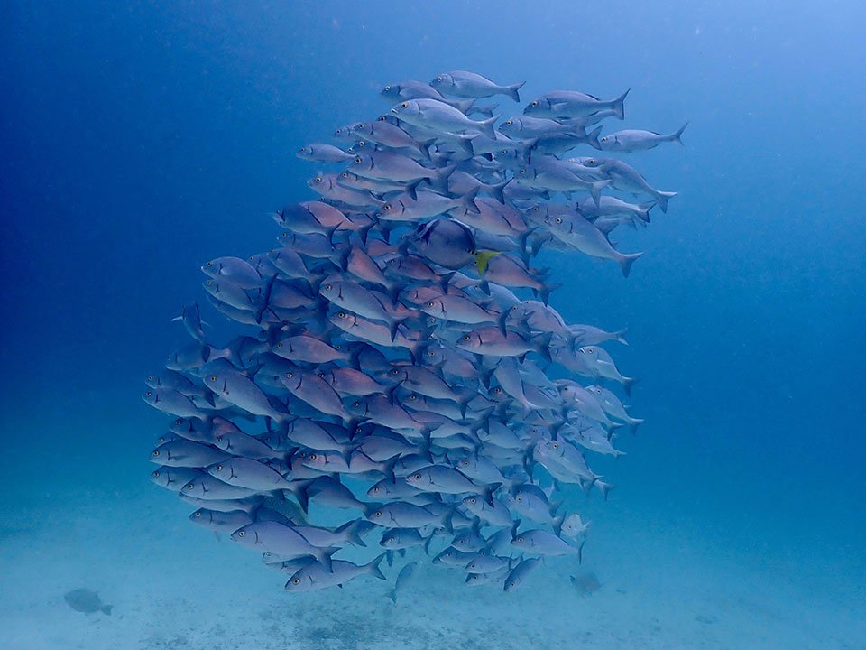 When you get to the outer edge of the pinnacle you are likely to find schools of Tuna, Wide-Mouth Mackeral, and Jacks drifting in the currents. On the reef you can encounter Hawksbill Turtles, Sweetlips, and an astonishing variety and quantity of colorful critters of all shapes and sizes, as well as Giant Sea Fans up to 3 meters wide! You should always keep you eyes peeled out into the blue, as Whale Sharks are known to make occasional appearances here!